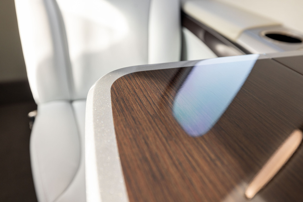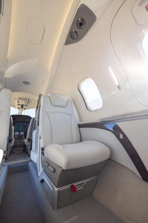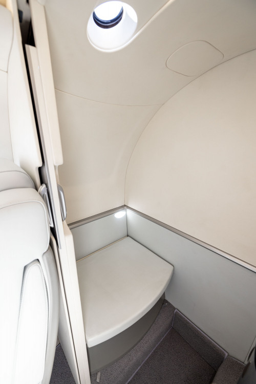 The new interior is configured in a 5-passenger layout with a club plus a belted side facing seat. Additionally, the aircraft features a private fully enclosed aft lavatory.