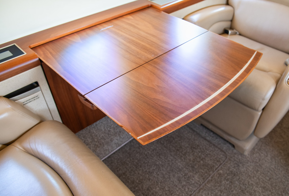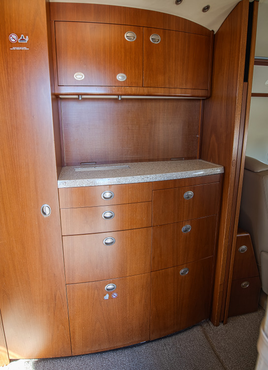 Stunning Interior Featuring Fire-Blocked Seating for Eight (8) Passengers in a Double Club Configuration, Forward Wardrobe with Adjustable Shelves, Forward Galley with Fold-Out Tables, and Aft Lavatory and Vanity with 16G Belted Lav Seat for Ninth Passenger Option.