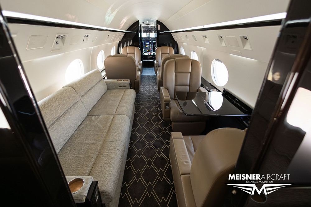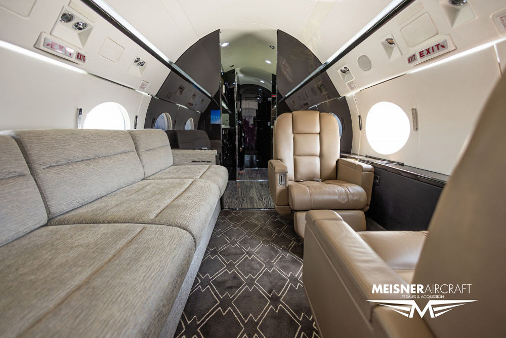 This aircraft features a 15-passenger interior configuration with a forward crew lavatory, an aft lavatory, and a rear galley. The forward cabin includes a four-place club seating arrangement. Mid-cabin, there is a three-place berthable divan opposite a pair of club seats. The aft cabin is equipped with a four-place divan facing another set of double club seats.