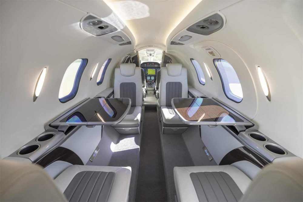 Lighted logo cabin floor trim, electrically-dimmable window shades, solid aft cabin door, three universal power outlets, brushed star silver, life vests