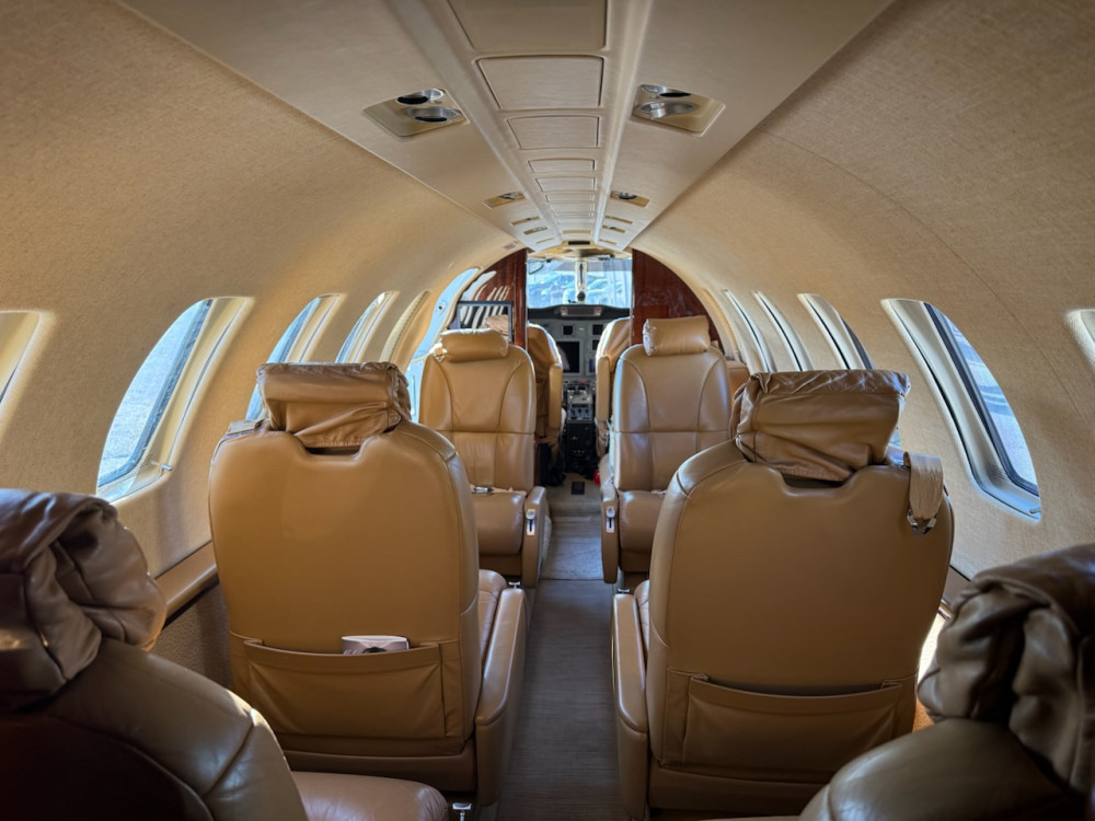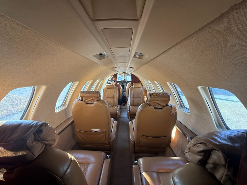 Six club seats plus forward side-facing seat, plus aft belted lavatory seat. Forward slimline storage, dual executive tables, LED lighting.