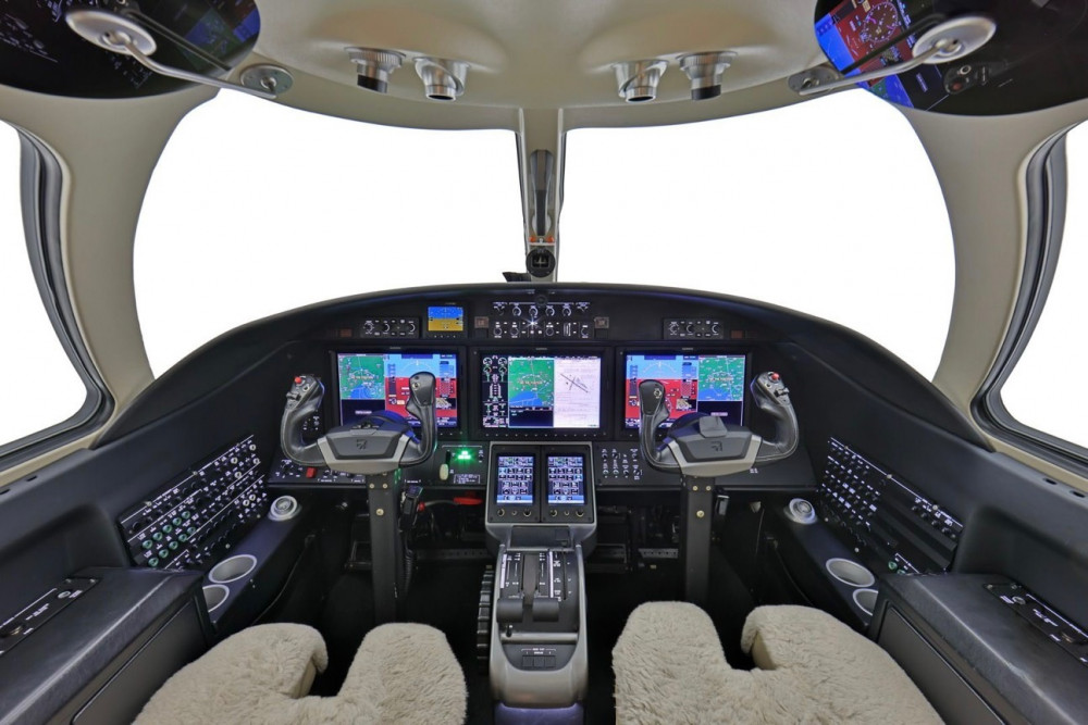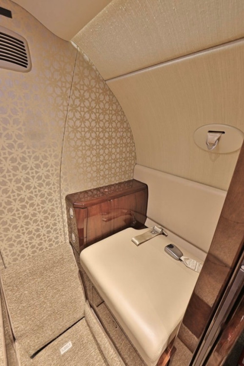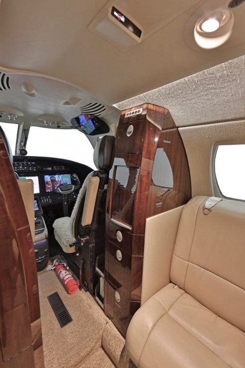 Executive eight (8) passenger interior includes a forward side-facing seat (option, interchangeable with galley), followed by four place club setting, two (2) aft forward facing seats and aft belted lavatory. All seating is completed in natural tan leather, and finished with Honduran Mahogany wood veneer, hardware in brushed metal, tweed headliner, and rich sandstone wool carpet.