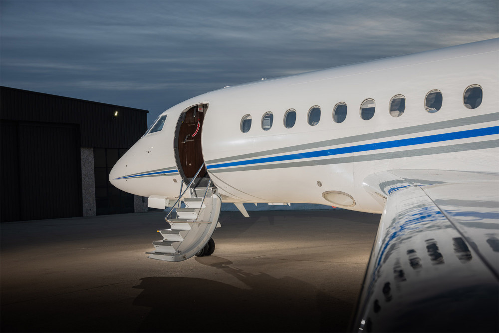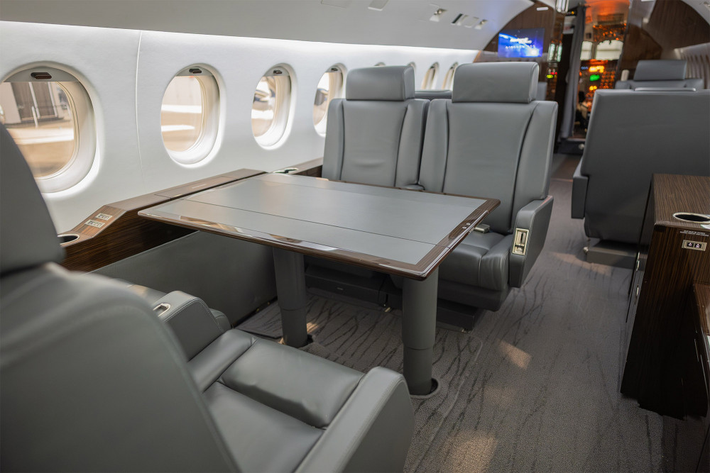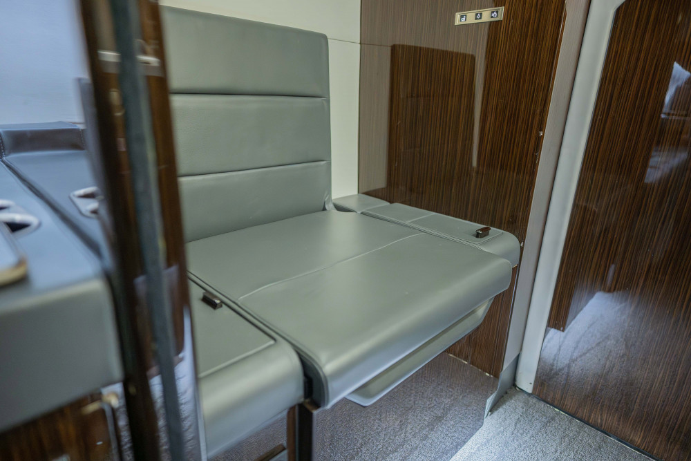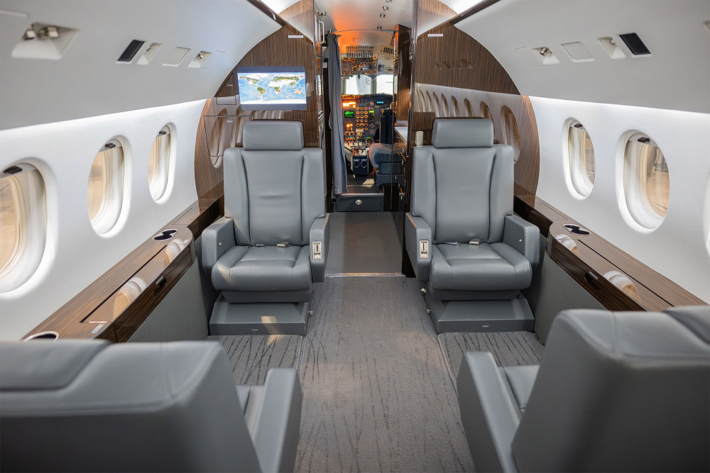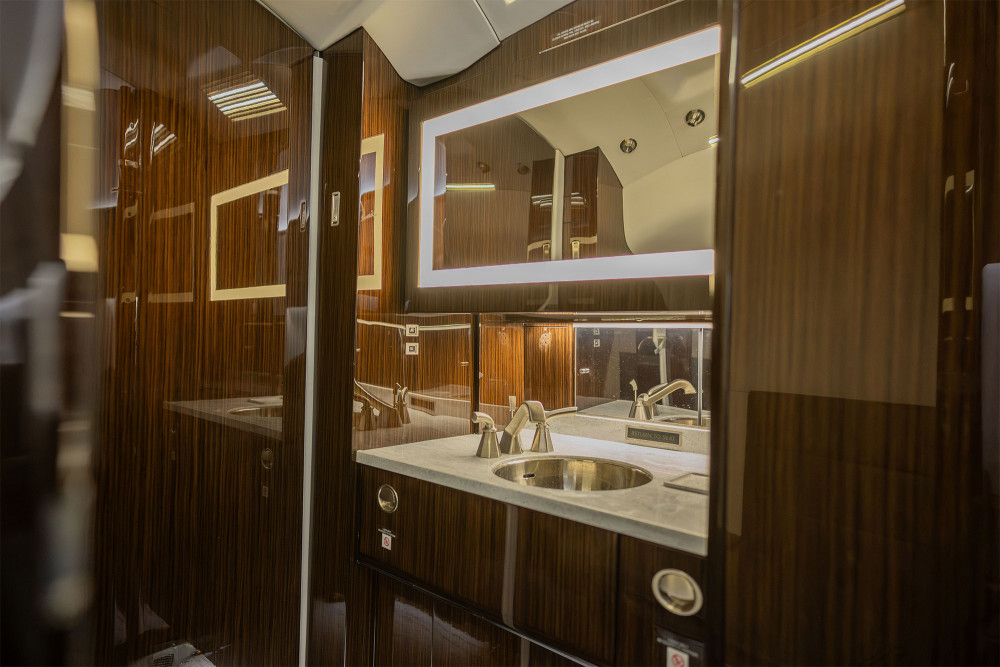 All materials are fully fire-blocked, including Garrett leather in a Chatham Thundercloud tone. The interior was extensively updated with entirely new wood veneer, along with refreshed lower and upper sidewalls and window lines. Bolon flooring was installed in the entryway, complemented by all-new satin nickel metal plating. The cabin is equipped with new Heads Up Technologies LED lighting throughout, along with an updated headliner system featuring the removal of traditional “subway” lights.