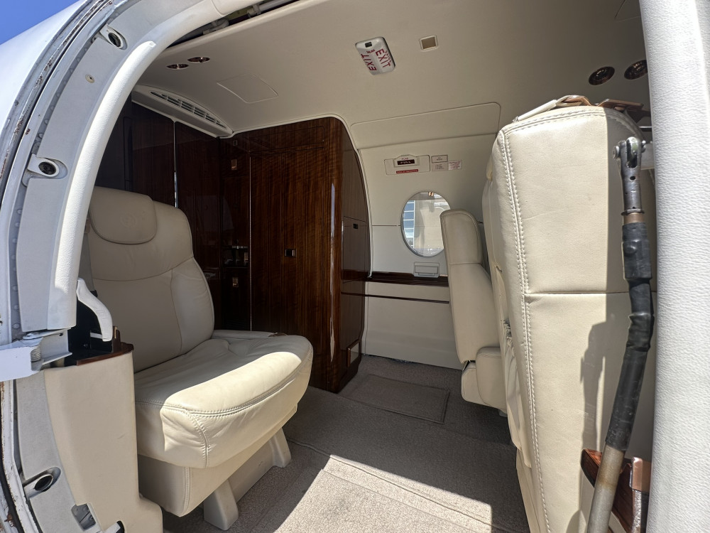 This beautifully refurbished eight passenger interior (7 + 1), completed in 2025, includes a forward four place club with an aft facing seat, followed by two forward facing seats and a belted lavatory.