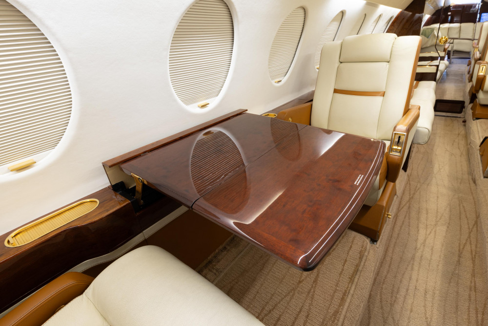 The cabin is equipped with an Airshow 400 system and a 15-inch monitor for passenger information and entertainment. Additional finishes include satin rose gold metal plating and bronze mirror accents.