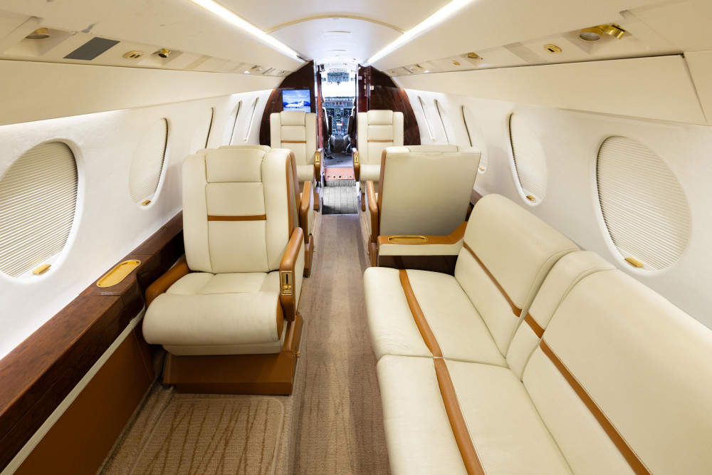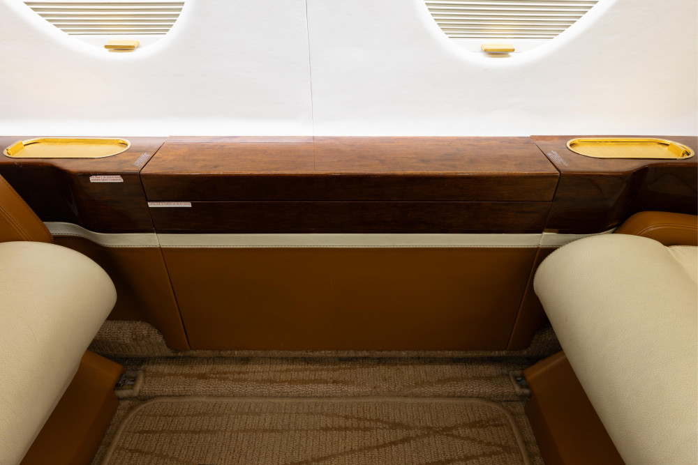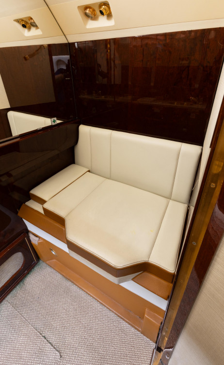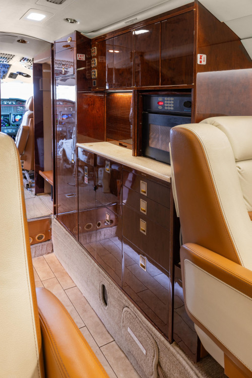 This executive interior is configured to accommodate up to nine passengers, with a forward four-place club arrangement, an aft three-place divan, and two additional single seats. The cabin features an almond Ultraleather headliner and tan focus grid carpeting with a coordinating band.