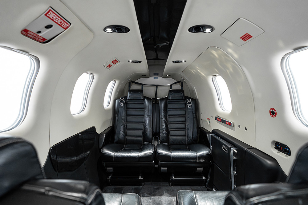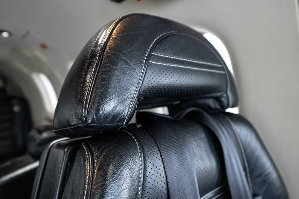 Elite configurable interior featuring six genuine leather seats with adjustable backrests and folding arm rests. Black Onyx leather seats with Polynesian Pearl stitching, Anthracite Carbon table. Leather upper cabin side panels in Polynesian Pearl, leather covered lower cabin side panels in Black Onyx.