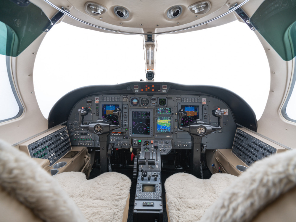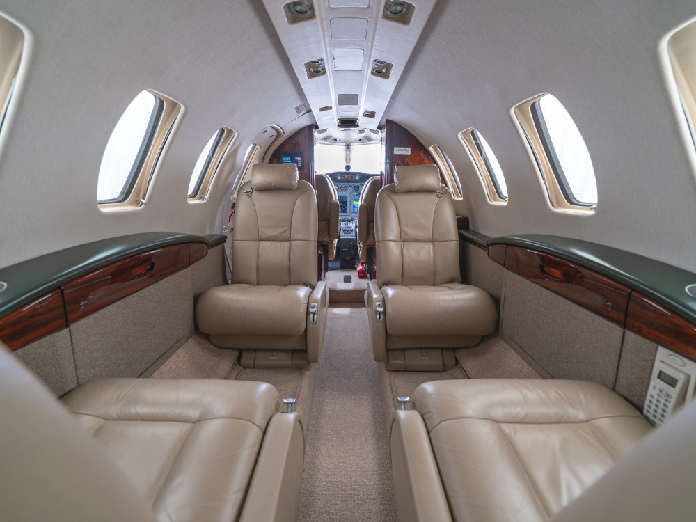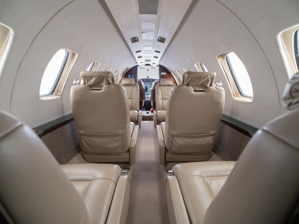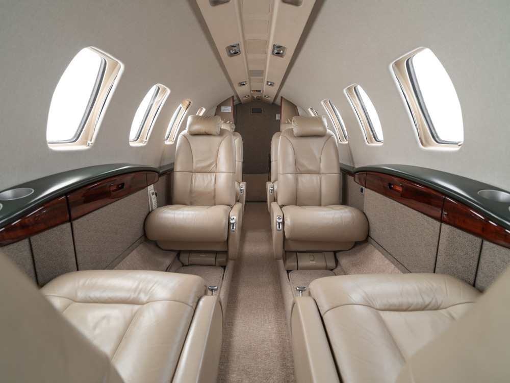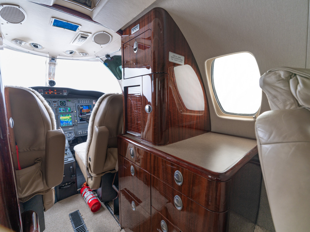 Six Sienna medium beige leather seats, 2024 sheepskin-covered crew seats and Jute level loop beige carpeting, Artisan mahogany gloss laminate cabinetry, aft divider, Leather top armrest inserts, Flushing belted aft lav, Three 110-volt AC outlets and Freon air conditioning.