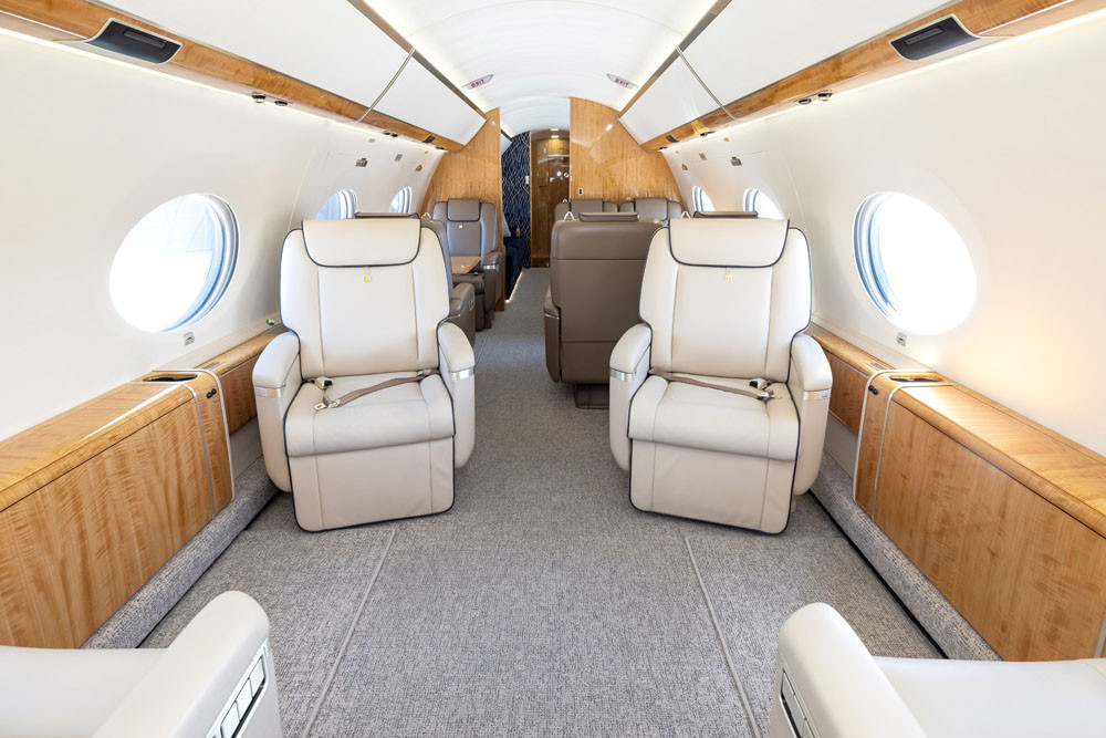The forward cabin features two forward-facing powered seats with electric lumbar, electric legrest, electric 4-way height adjustment for base cushion, electric recline with berthing capability, memory pre-set, back cushion massage, and cushion heat. The cabin’s manual single seats and the crew compartment manual seat all have an adjustable seat pan, manual legrest, and electric lumbar. The cabin double seats have electric lumbar and drop-down inboard and center armrests. A removable panel in the forward righthand closet permits crew compartment seat full flat berthing. The two (2) 80” 3-place divans feature 39” berthing. An electrically operated console table with manual leaf is located at each club seating area, and a 3-position manual conference table is located at the mid-cabin conference group.