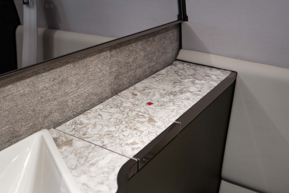Sandstone Interior Scheme. The Cabinetry is Qtr. Figured Mahogany High Gloss Wood Veneer with Satin Smoked Nickel Hardware.